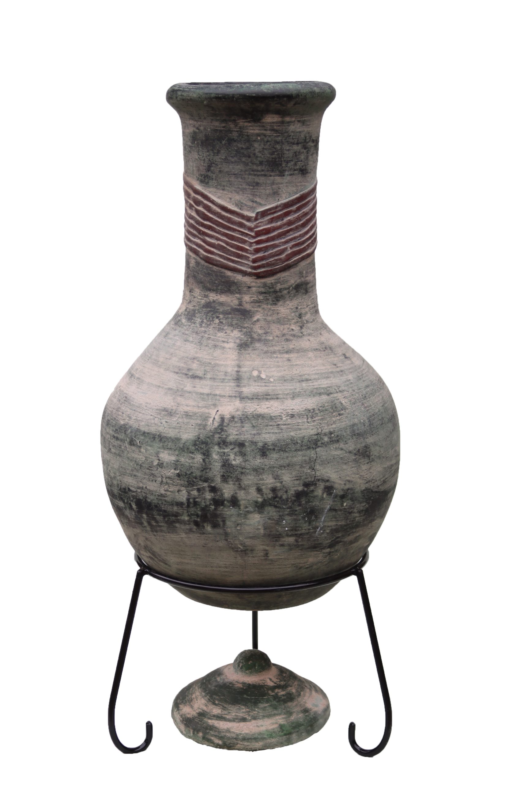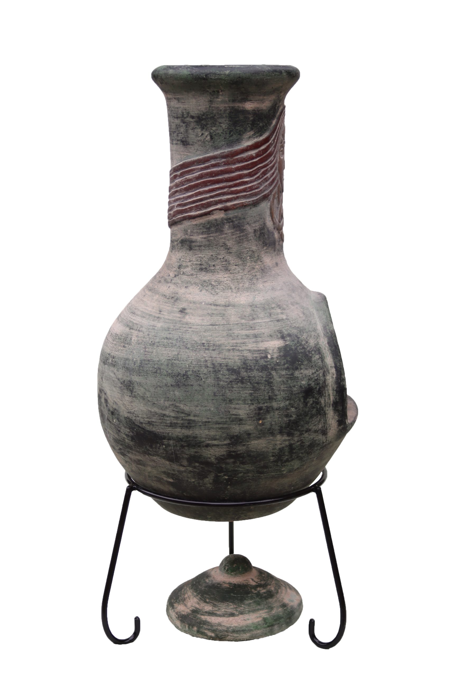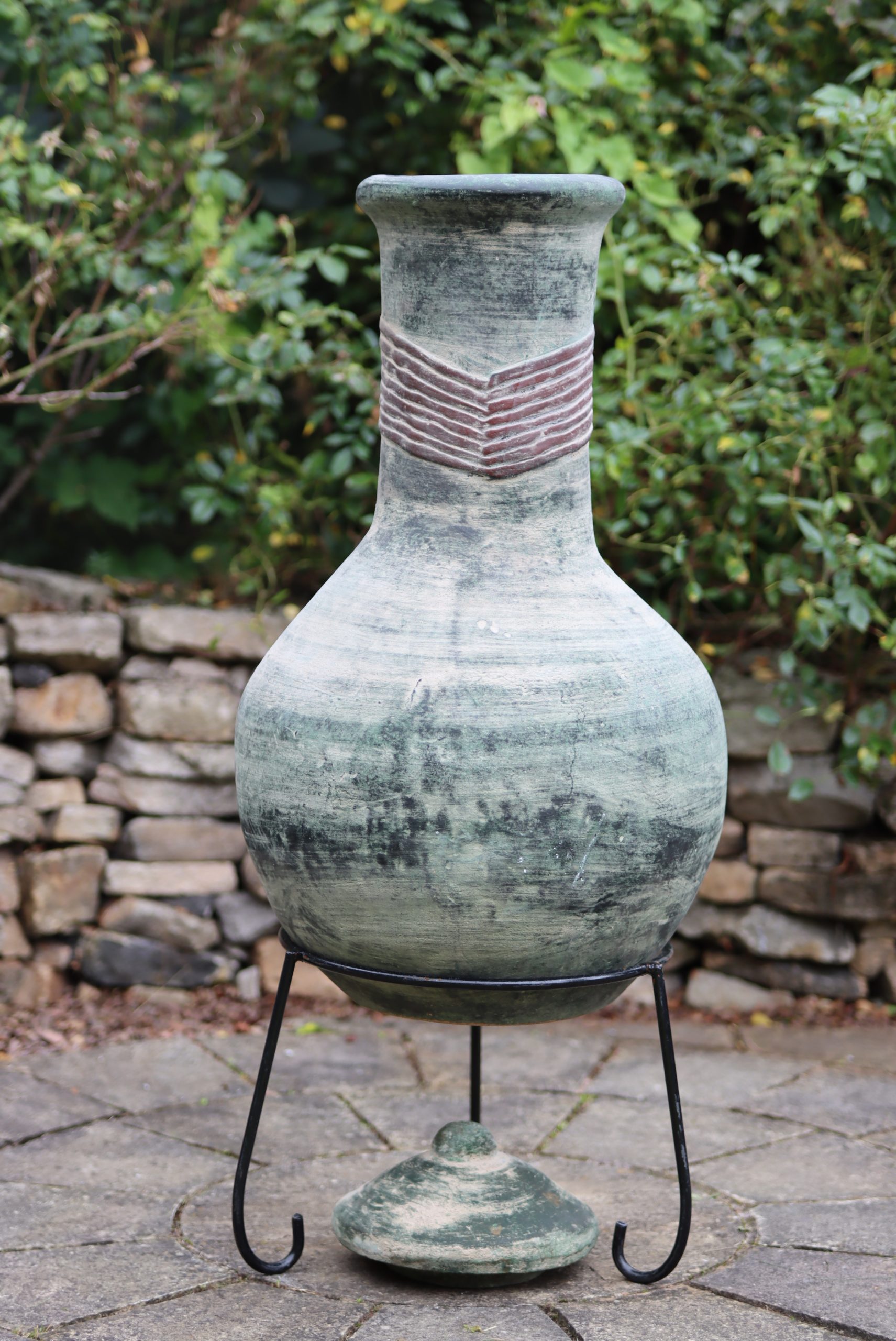 Extra-large Boudicca Mexican chimenea in green and brown. Comes with a steel stand, and a matching clay lid.