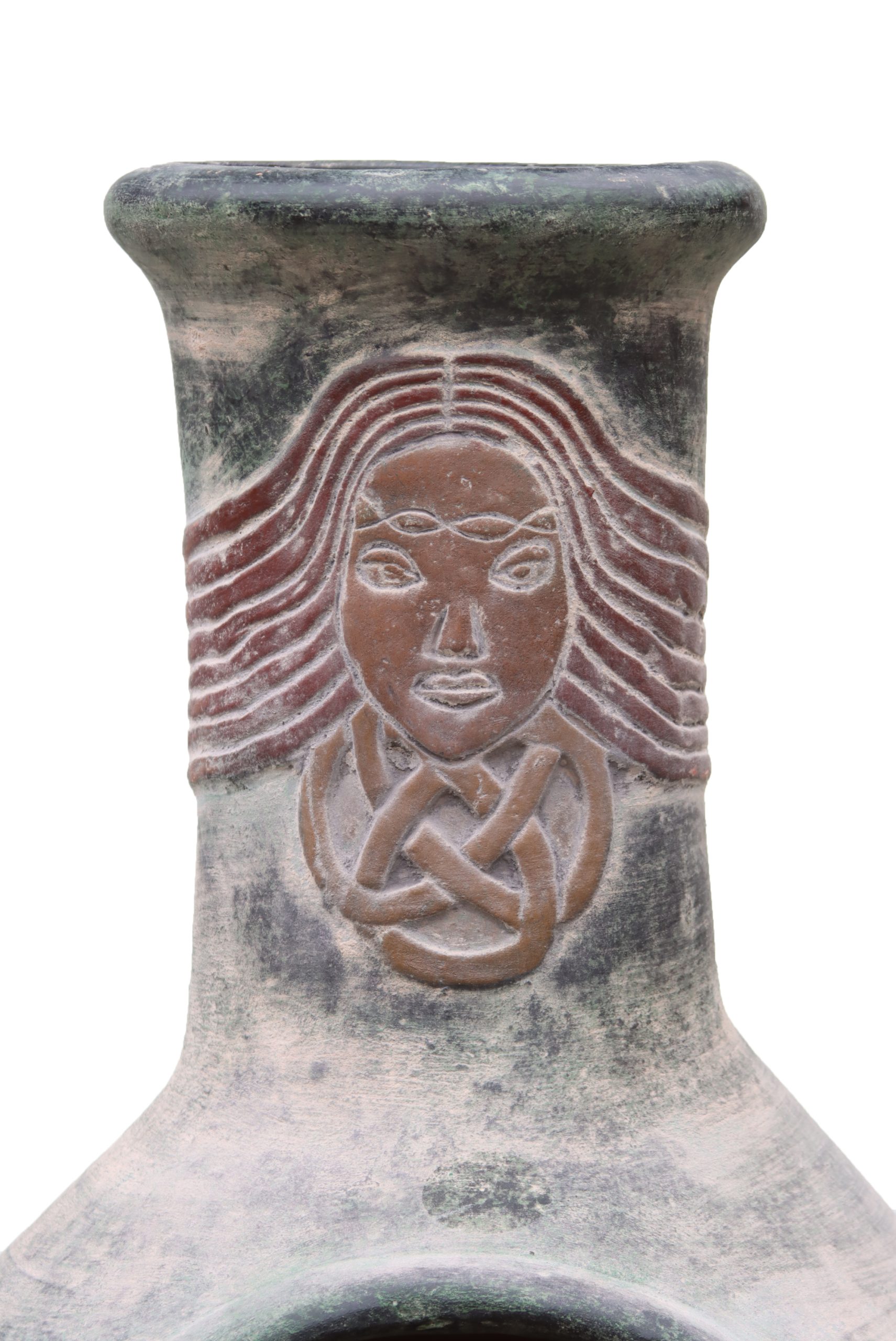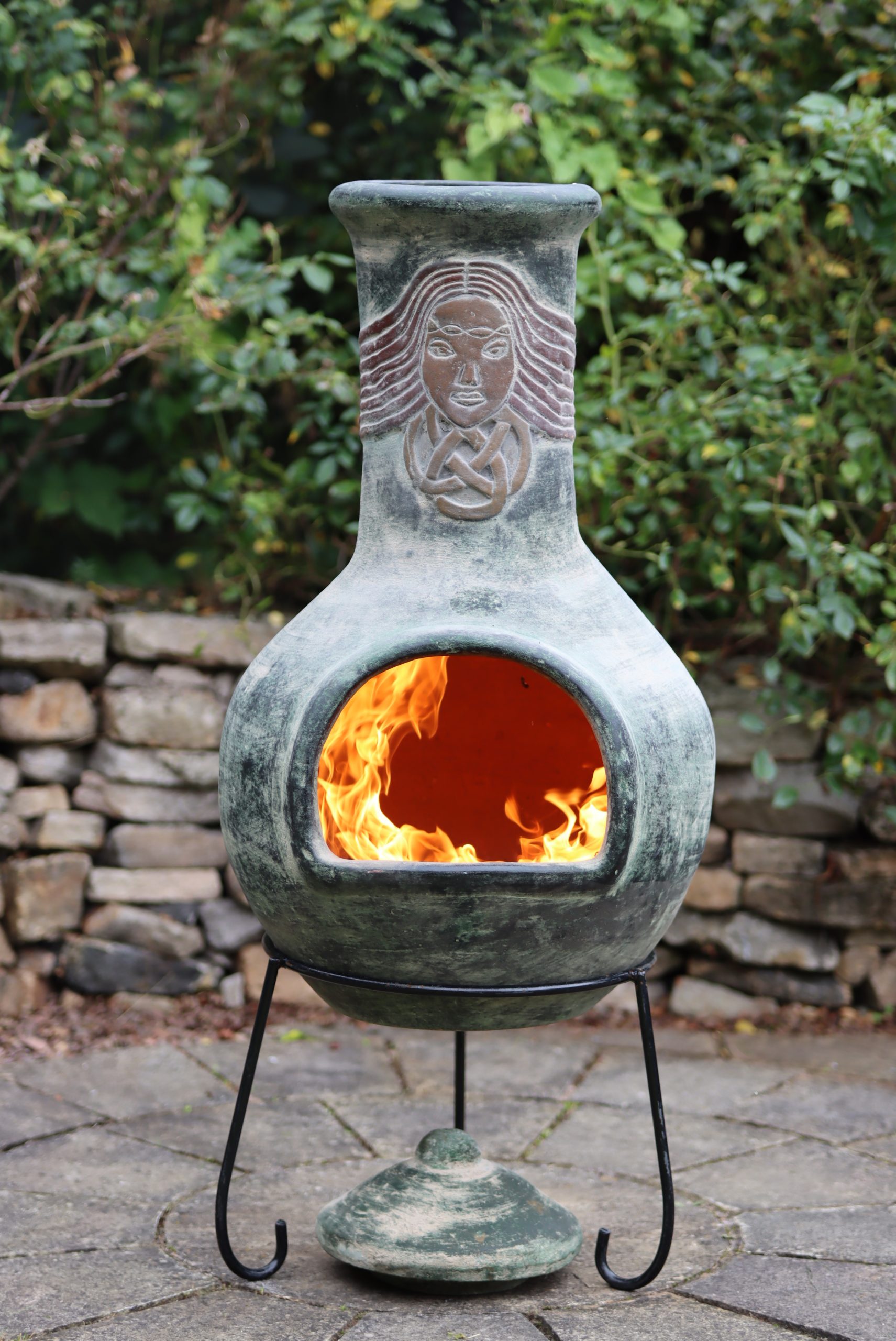 The design of the Extra-large Boudicca Mexican chimenea: A chimenea with a Celtic image of Boudica on the funnel.
