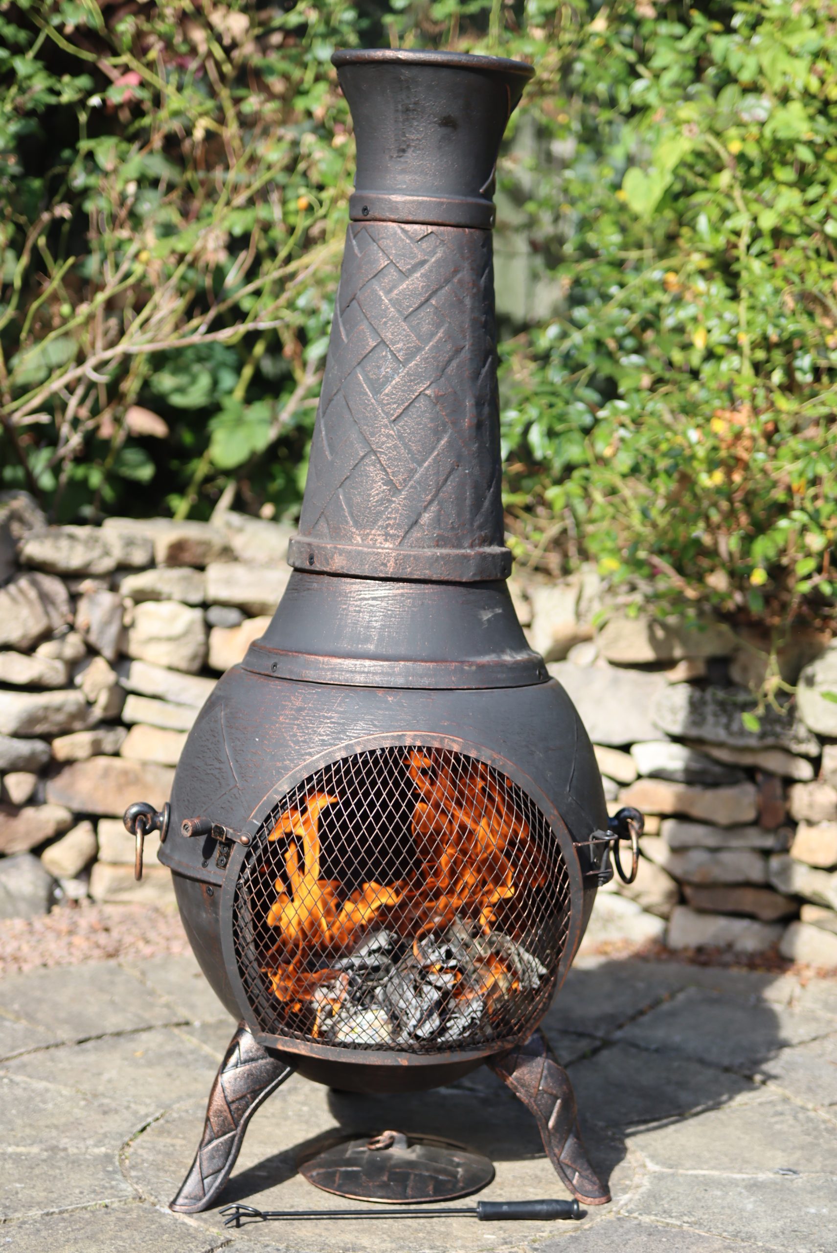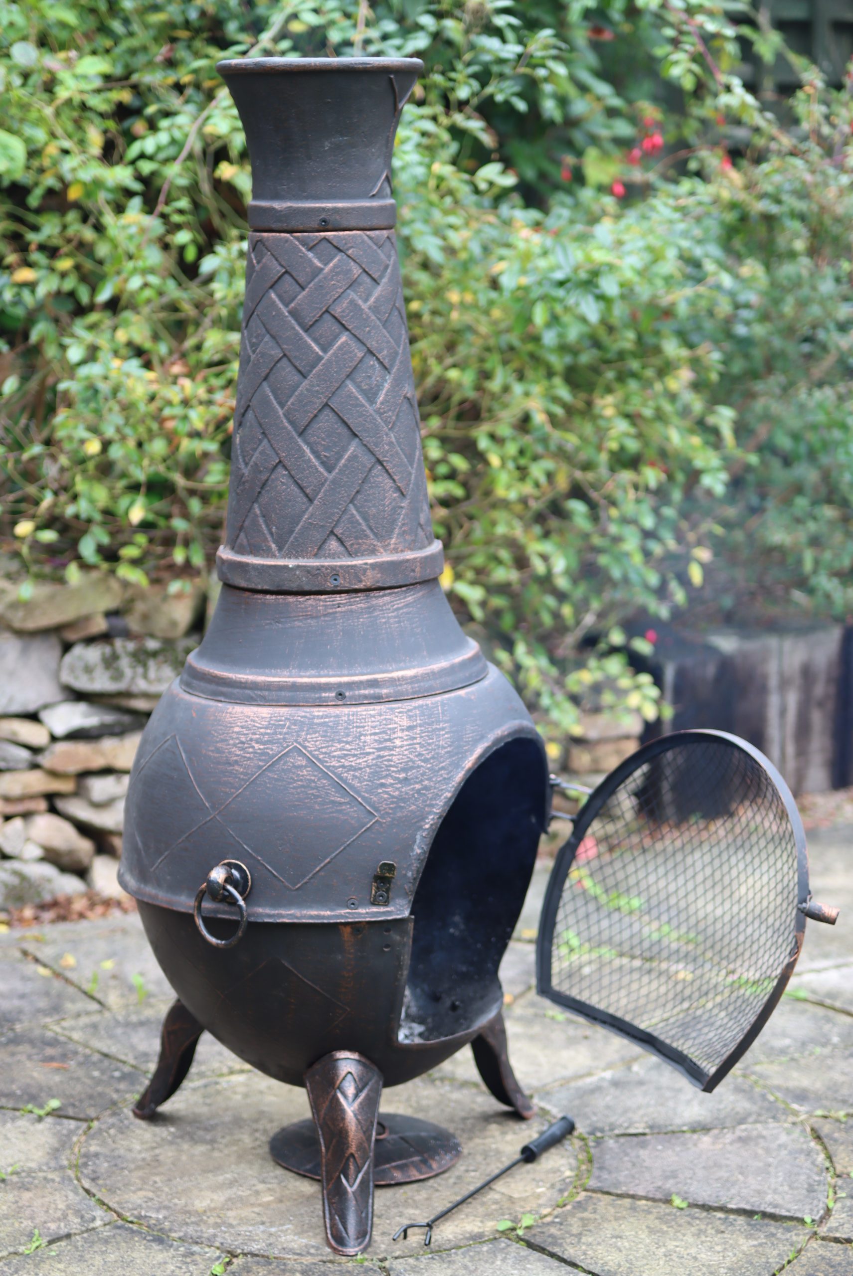 Jumbo cast iron chimenea, in bronze. Comes with a matching lid and a poker. It has a 5 year guarantee against thermal shock.
