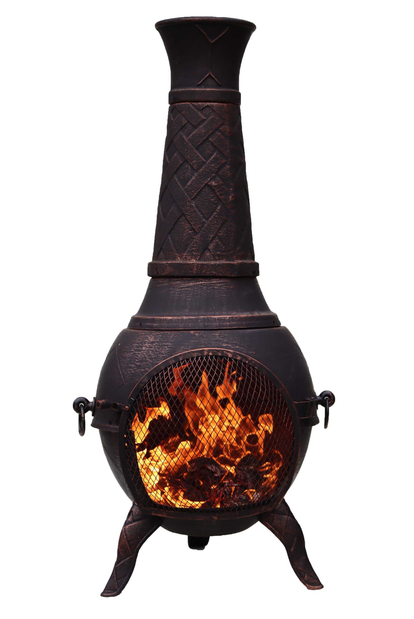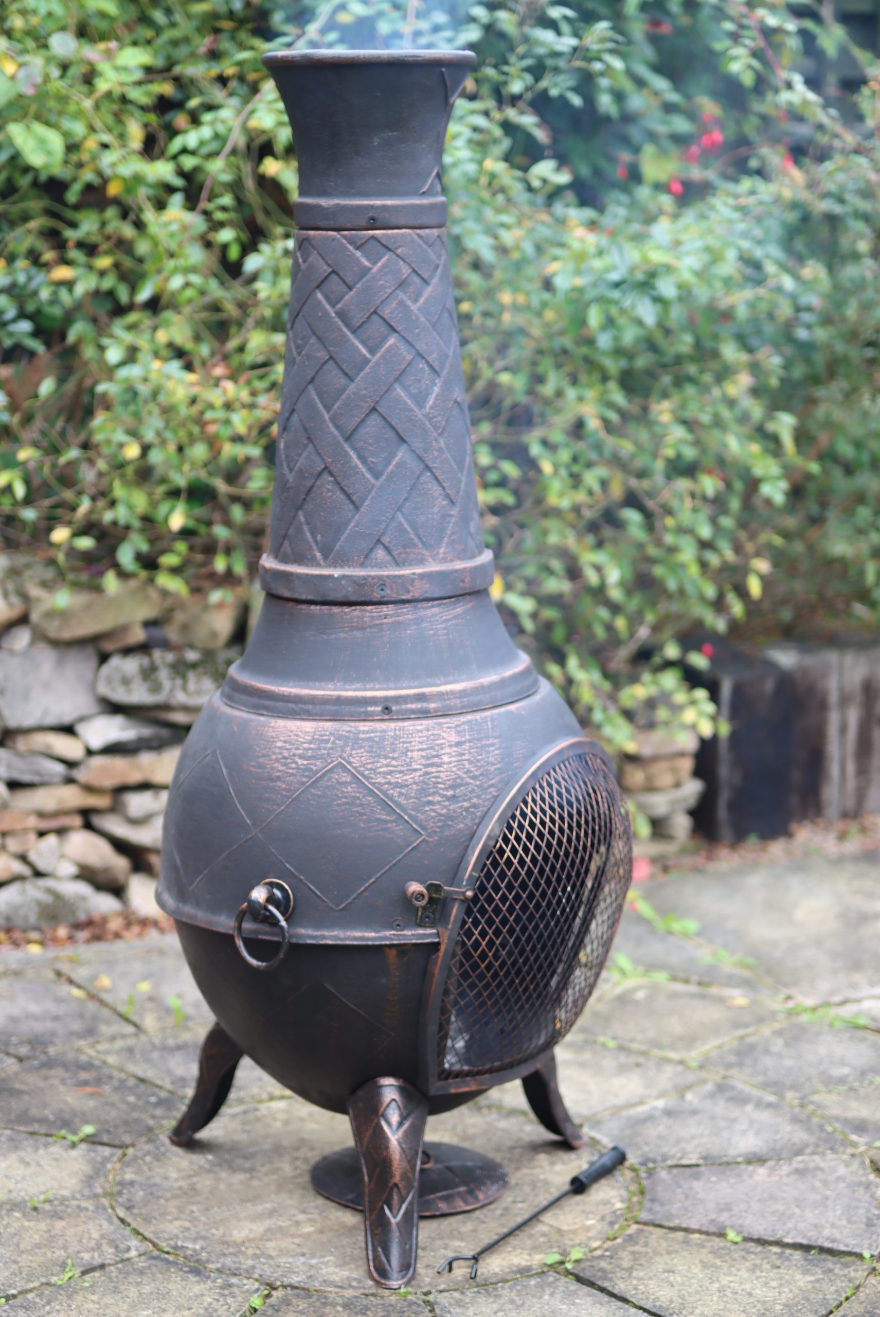 The Jumbo cast iron chimenea has a criss-cross, weave type pattern going around the funnel as well as the legs.