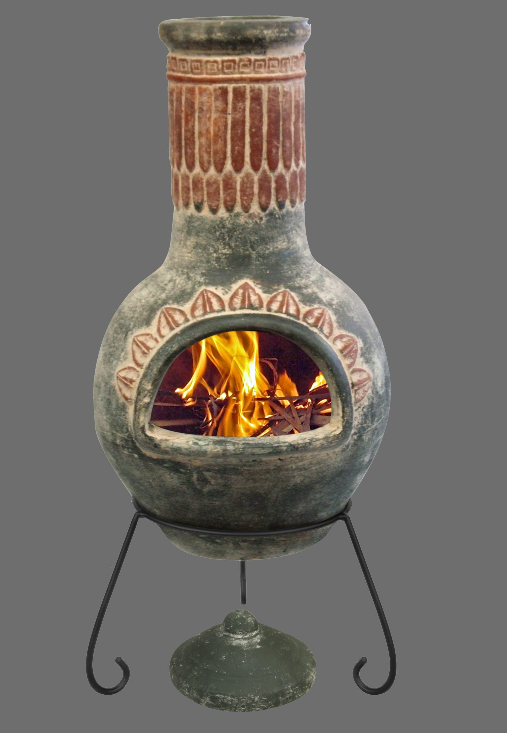 Large Plumas clay chimenea in a rustic green colour, comes with a matching clay lid and a steel stand.