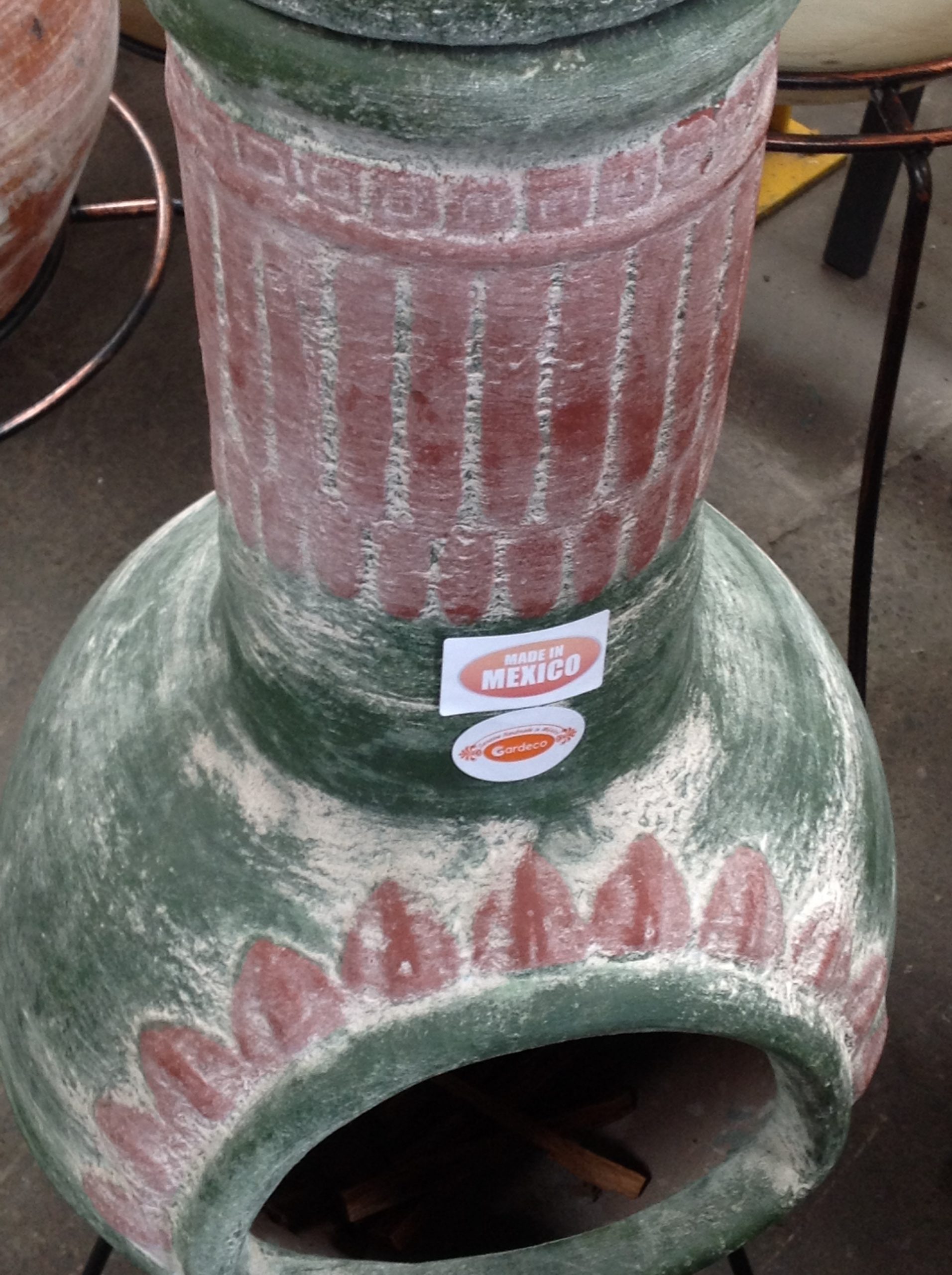 The design of the large Plumas clay chimenea: Green with a red motive the goes around the mouth and neck